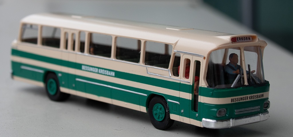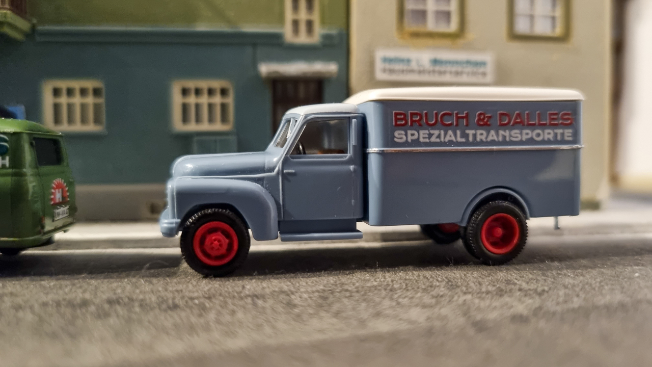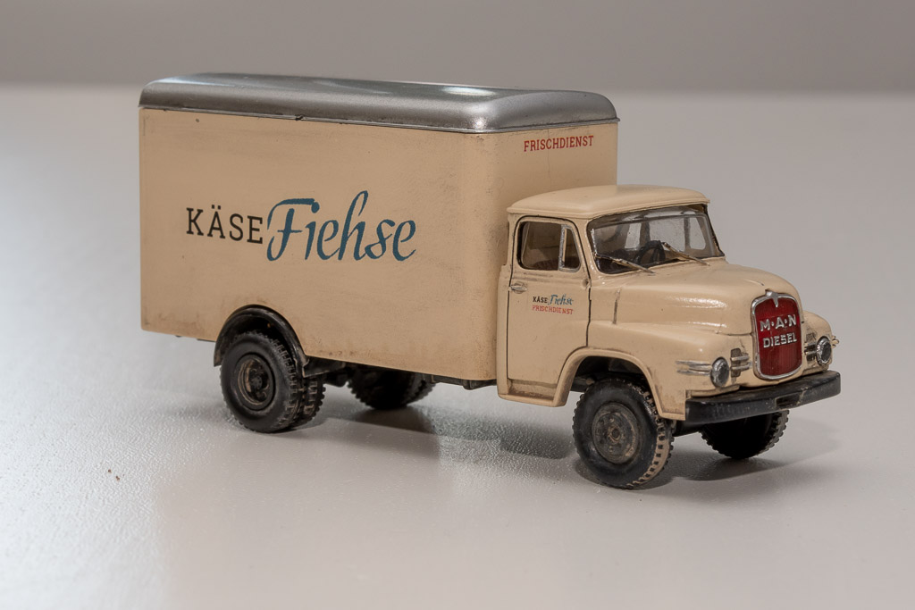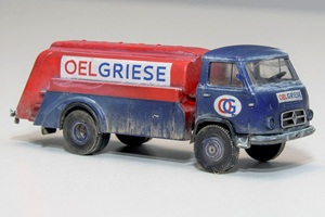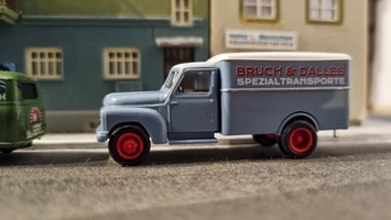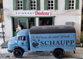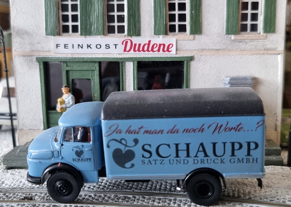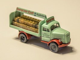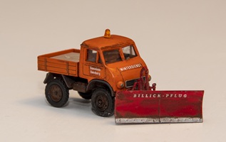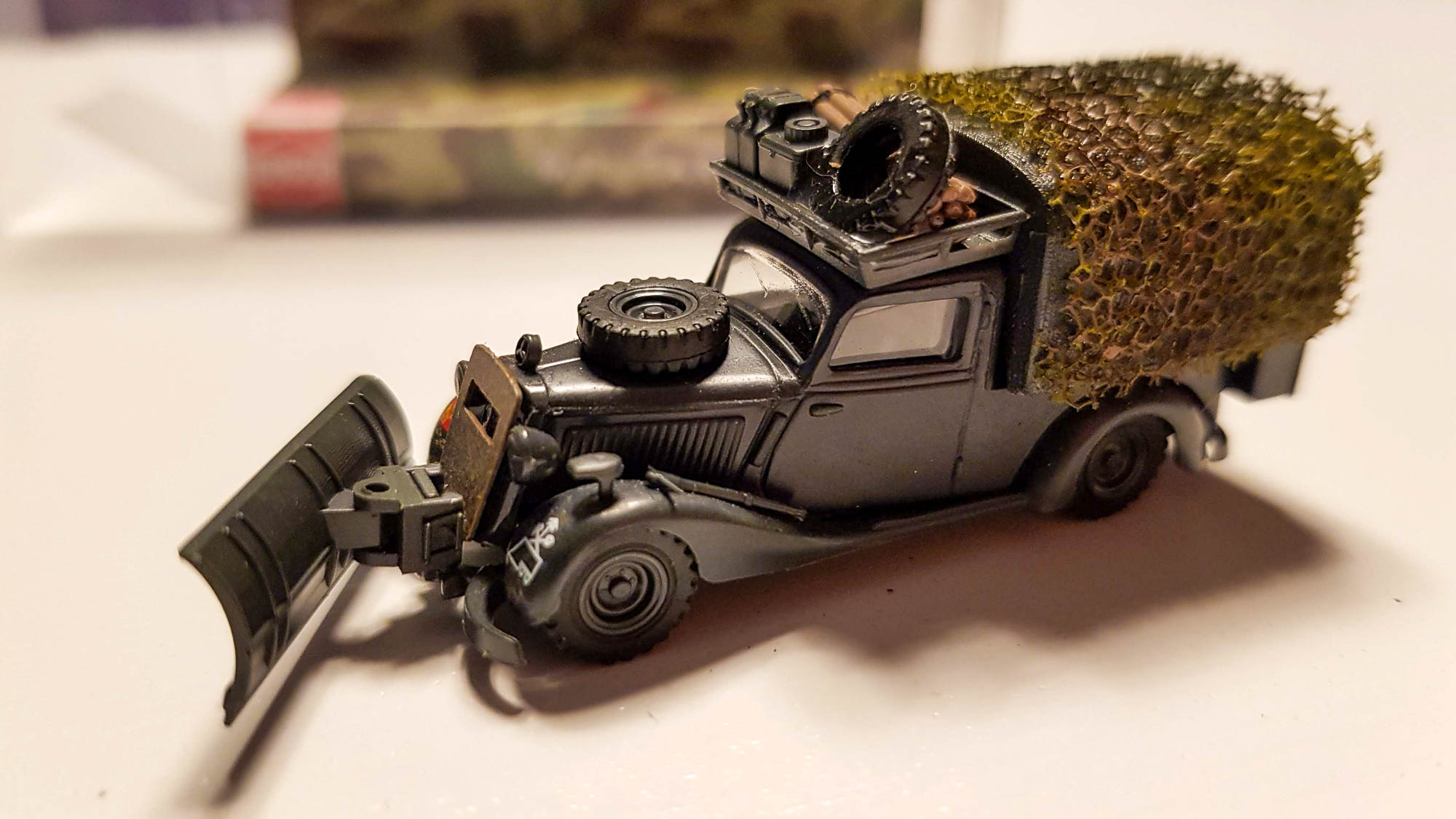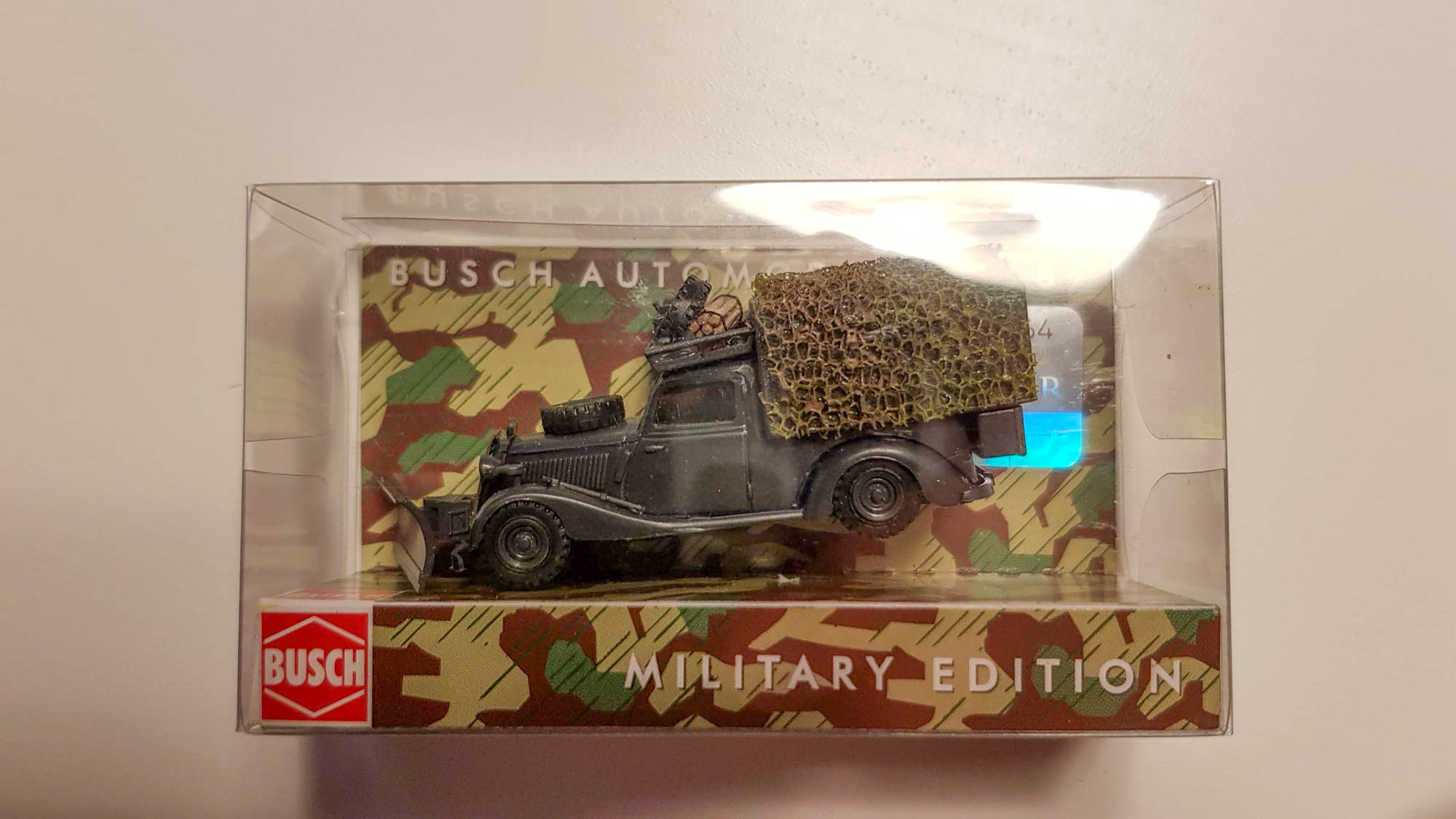 Die Firma Busch liefert seit einiger Zeit auch Abwandlungen ihres Sortiments in Wehrmachts-Outfit (Für die "Das wird man ja wohl noch kaufen dürfen!"-Kundschaft). Dank eines Ausverkaufes konnte ich einen Mercedes 170 Pritsche/Plane mit Schneepflug äußerst preiswert erstehen (Stichwort: Halber Preis) und da konnte ich altes Sparbrötchen natürlich nicht nein sagen.