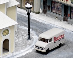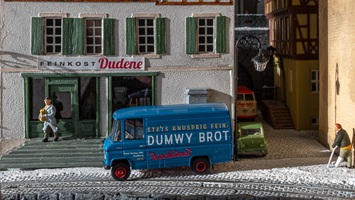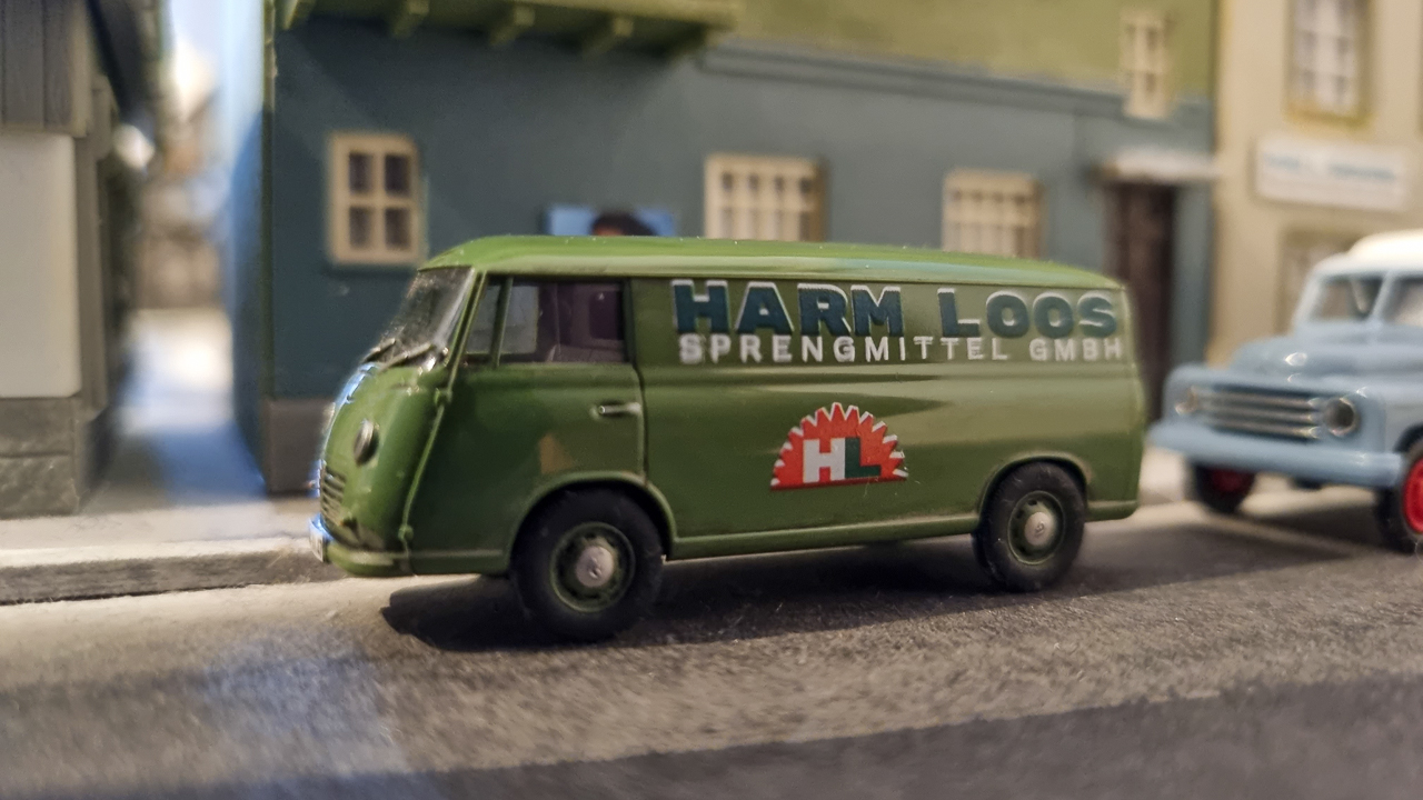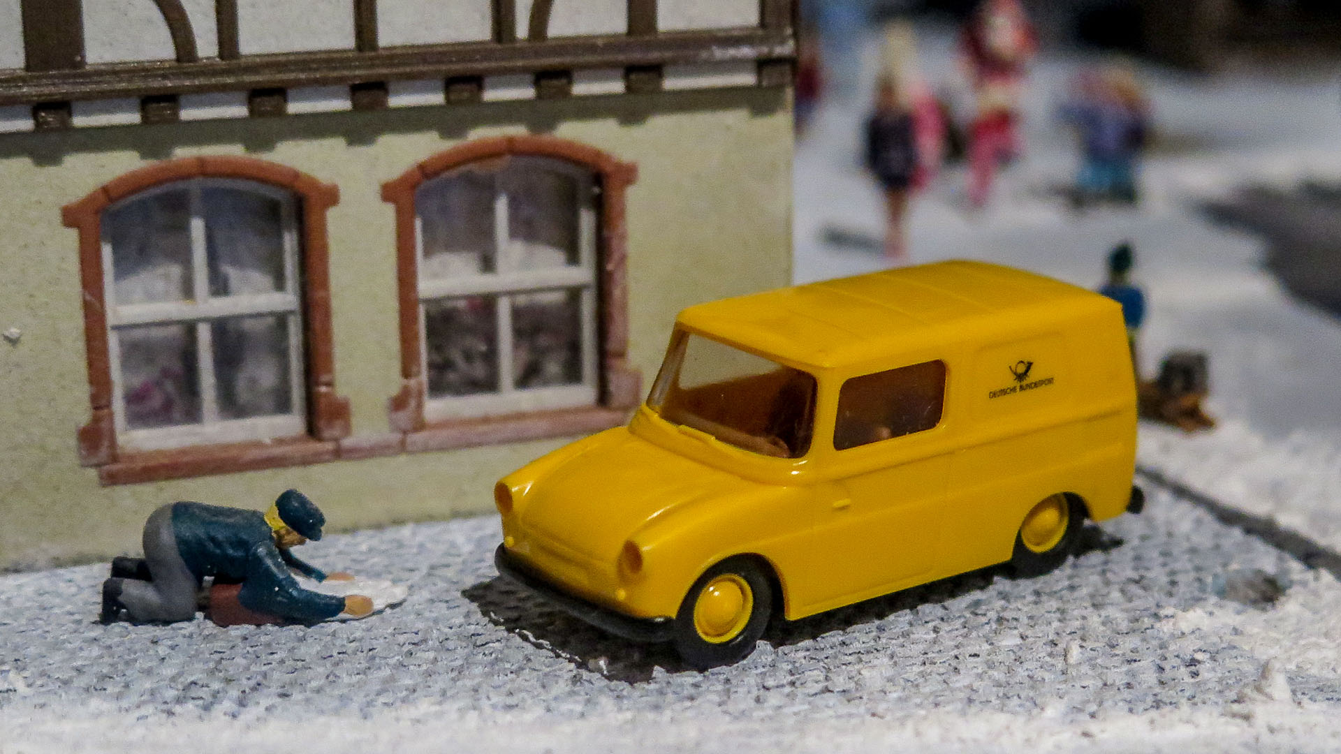 Die Goggo-Transporter knattern schon eine ganze Weile tüchtig durch die engen Gassen von Sandberg, aber ihre Kapazität ist halt doch begrenzt. Die Post hat das natürlich erkannt und bei Volkswagen einen weiteren Sproß aus der großen Familie der Krabbeltiere in Auftrag gegeben, der theoretisch "Typ 147" heißt, praktisch aber auf den schönen Namen "Fridolin" hört. Schluß mit Zweitaktgeknatter, statt dessen blubbert und trillert der Boxer im Heck, was natürlich die Beladungsmöglichkeiten von der Rückseite etwas einschränkt, aber dank praktischer Schiebetüren gar nicht so sehr ins Gewicht fällt. Fast drei Kubikmeter Laderaum sind schon eine deutliche Ansage, und bei über 400 kg Zuladung geht einiges an Weihnachtsgeschenken in den kleinen Lieferwagen.