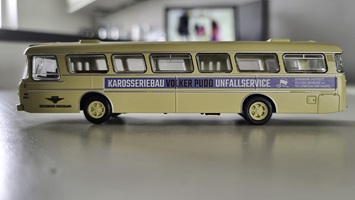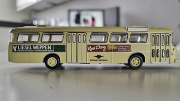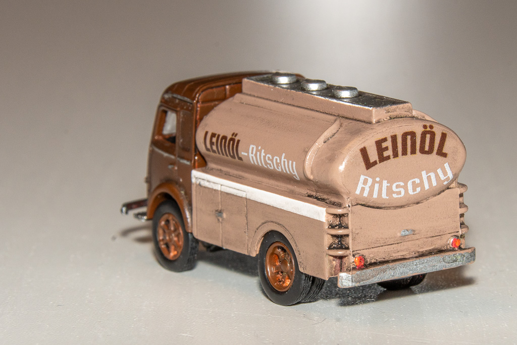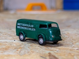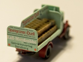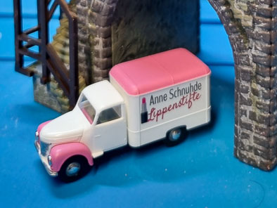 Das Modell ist ein alter Bekannter aus seligen PRALINE-Zeiten, auch wenn am Boden jetzt deutlich höherliegend (weil tiefer eingraviert) "Busch" steht. Unter dem Aufbau verbirgt sich ein ganz normales Limousinen-Fahrgestell mit Rücksitzbank, auf die der Pritschenboden einfach aufgeklebt ist.