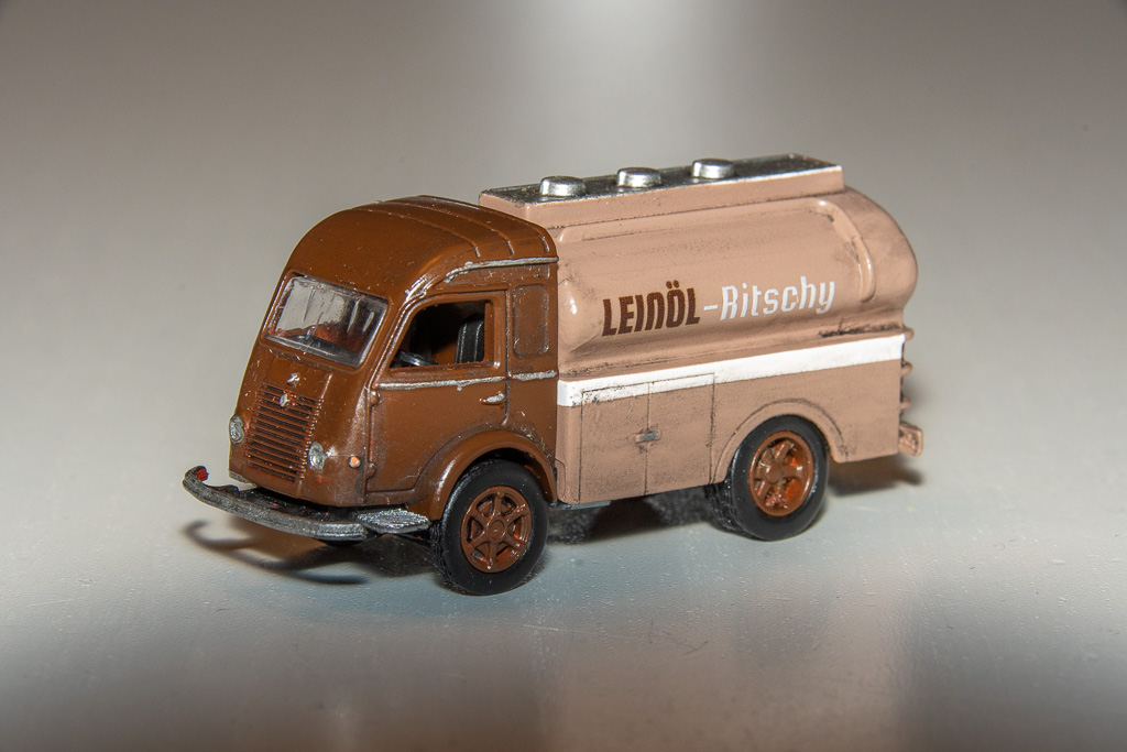 Dann erst mal eine Grundierung fein drübergespritzt. Danach eine Schicht in verschiedenen Rosttönen. Ich habe Fahrgestell und Karosserie verwitterungstechnisch erstmal als Testfelder genutzt und unterschiedlich behandelt: Die Fahrgestellteile (Kotflügel, Trittbretter, Stoßstangen, Felgen) bekommen eine Zwischenschicht aus punktuell aufgepinseltem Chipping Medium, bei der Karosserie wende ich erstmals die Salzmethode an. Das geht recht einfach, man feuchtet die später mit Lackabplatzungen versehenen Stellen an und streut Salz drauf. Kurz antrocknen lassen (geht schnell, weil das Salz das Wasser anzieht) und dann mit dem Decklack drüber. Das ganze Fahrzeug bekommt ein helles Grau, wie es in den Zeiten vor dem "Kommunalorange" gern genommen wurde.