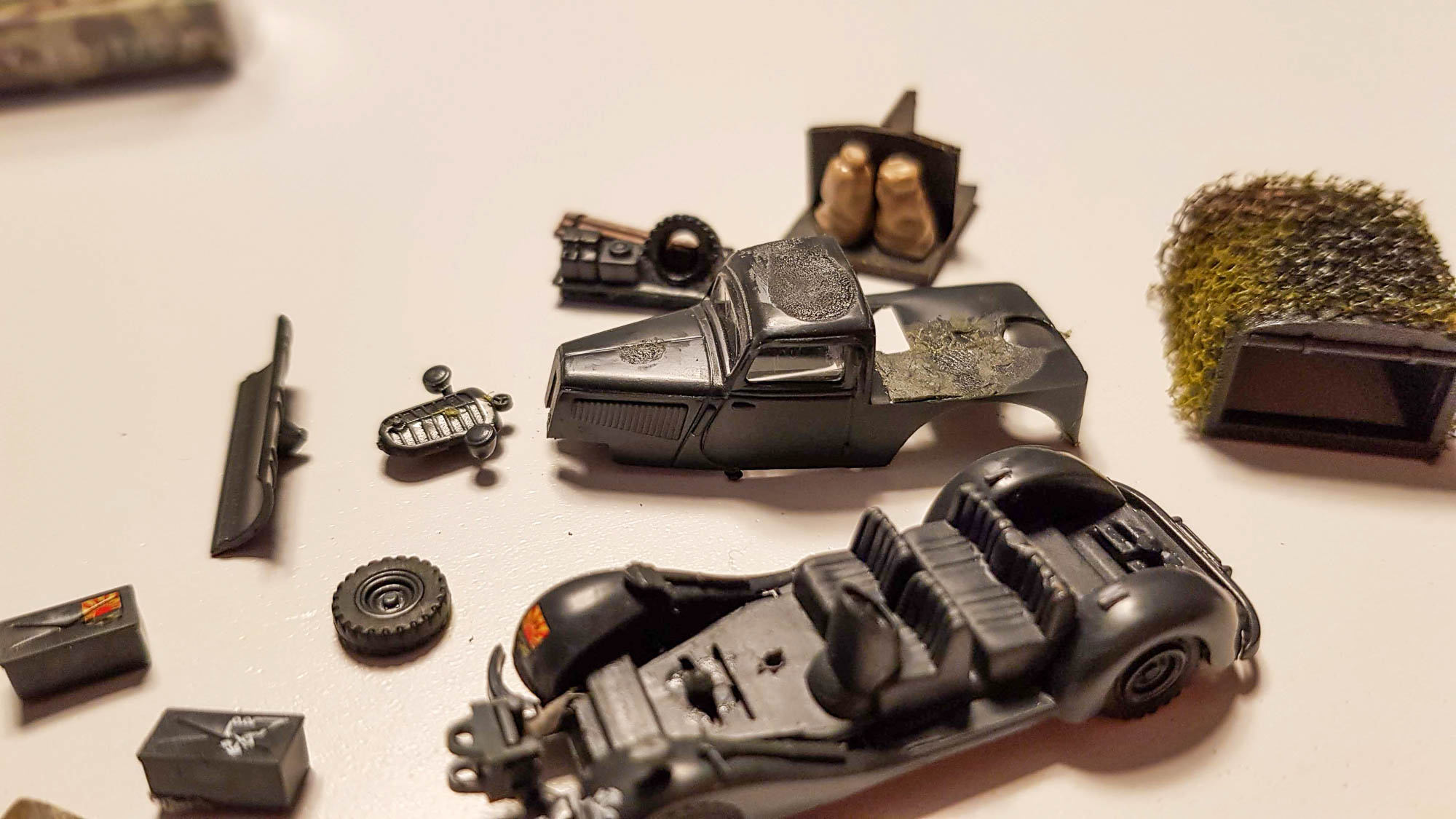Die Sammler von Plastikdevotionalien des 2. Weltkrieges müssen (so sie überhaupt bis hierher vorgedrungen sind) jetzt ganz stark sein: Ich demilitarisiere ein Fahrzeug der "krroostoitschen Lufftfaffe". Göring, der fette Junkie in Operettenuniform, hätte das jetzt eher so mittelgut gefunden, kriegt das aber in der Hölle nicht mit. Prima.