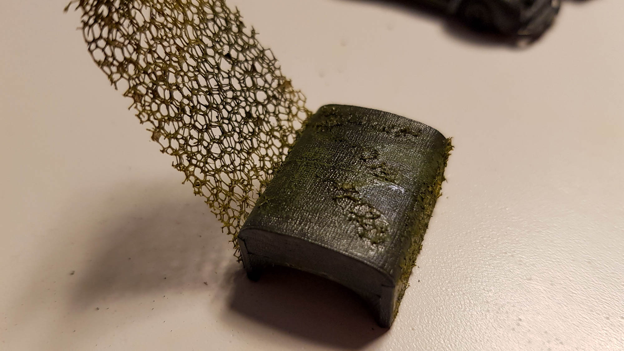 Das ein Tarnnetz mimende Stück Schwammtuch über der Plane hätte ich gerne schnell wie ein Windhund entfernt, leider erweist sich die Verklebung als zäh wie Leder, sodaß ich das Gefühl habe, tausend Jahre daran herumzufummeln, bis das Zeug endlich ab ist. Dieser Arbeitsschritt war wirklich hart wie Kruppstahl. Nagellackentferner bringt dann doch noch den Endsieg über das Zeugs auf der Plane.