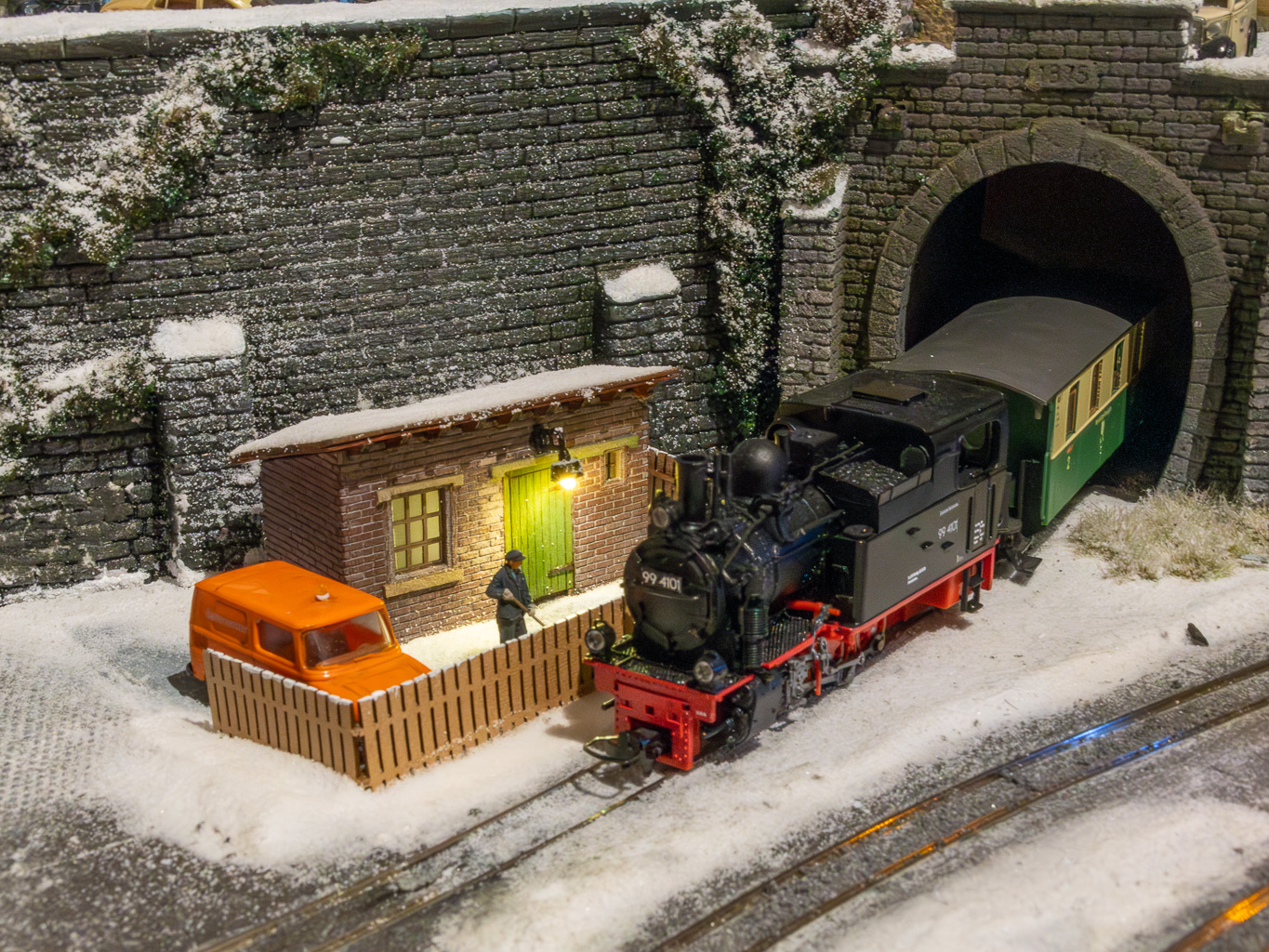 Der Kälteschutz vorm Kühler (den ich dann doch nicht wiederverwende) und die Pritschenfläche nebst Inneneinteilung bestehen aus gelaserter Pappe. Zwei Streusalz-Säcke befinden sich auf der Ladefläche.