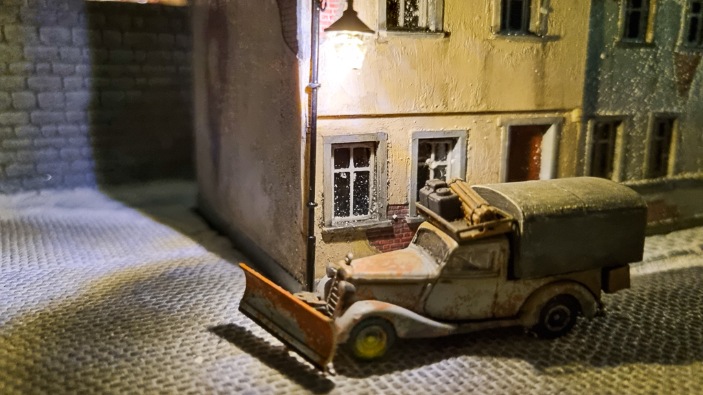 Am Ende bekommt das Fahrzeug natürlich noch eine Gesamtbehandlung mit Rostfarben und verschiedene "Washes". Das Schneeschild habe ich in Orange lackiert, durch die Verwendung von Salz schaut schön das blanke Metall durch (das ich mit Stahlfarbe vorher aufgepinselt habe).
