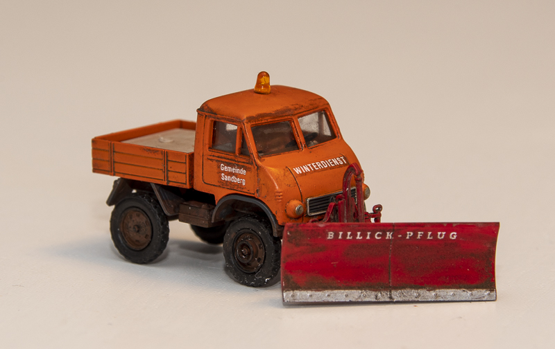Und siehe da: Frieden ist machbar, Herr Nachbar. Schon schiebt der Benz statt Landebahnen für Jagdflieger ganz zivil Schnee in Sandberg, sehr zur Freude der Bewohner des Städtchens. Und das ist sogar authentisch, denn nach dem Krieg wurden viele ehemalige Militärfahrzeuge, sofern noch halbwegs fahrbereit, nach günstigem Erwerb auf diese Art zweitverwertet. Na gut, der Gute hat es schon ziemlich hinter sich...