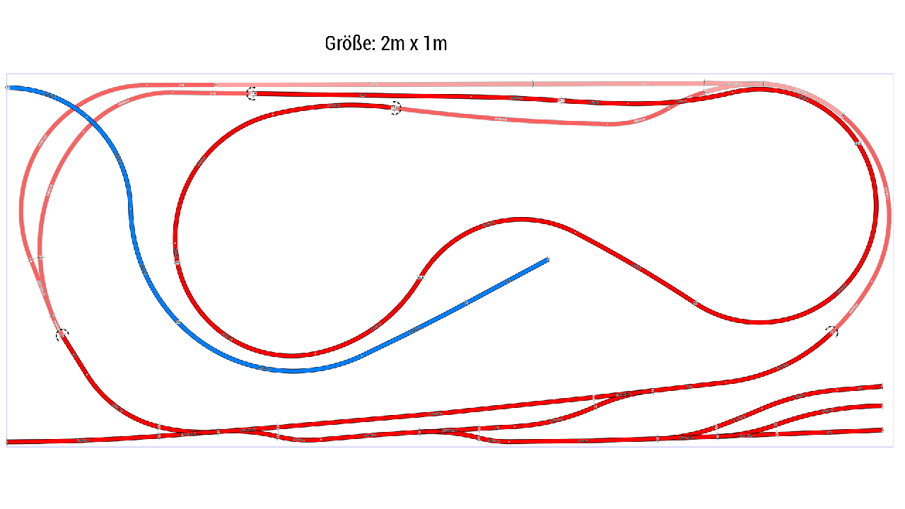 Aufgrund der durch die Lagerung im Keller vorgegebenen "Packmaße" von 2 x 1m ist das Ganze natürlich etwas tricky und funktioniert nur dank der Ausnutzung der maximalen Steigungen für den Reibungsbetrieb, wobei die Rampe von oben nach unten sogar einen Tick zu steil geraten ist. Da die Strecke aber erstens nur von leichten Fahrzeugen (Triebwagen, kurze Züge) und zweitens (warum auch immer, einfach aus Gewohnheit) eher gegen den Uhrzeigersinn befahren wird, ist es doch erstaunlich betriebssicher geworden. Der Plan ist insofern nur zugrundeliegend, weil die gesamte Anlage mit Flexgleis und relativ frei verlegten Bögen gebaut wurde. Rot sind HOe-Gleise (Tillig-Material), blau die Zahnradbahn. Hier der nicht mehr ganz aktuelle, aber immer noch repräsentative; Zustand in der Dreiviertelansicht - mit erstem Kulissenversuch.